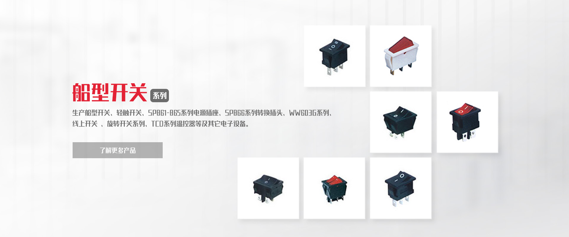 公司專業(yè)生產(chǎn)船型開(kāi)關(guān)、輕觸開(kāi)關(guān)、SP861-865系列電源插座、SP866系列轉(zhuǎn)換插頭、WW11系列微動(dòng)開(kāi)關(guān)、WW01-03、09系列按鈕開(kāi)關(guān)DS、WW系列指示燈開(kāi)關(guān)、WW603G系列 線上開(kāi)關(guān) 、旋轉(zhuǎn)開(kāi)關(guān)系列、TCD系列溫控器等及其它電子設(shè)備。